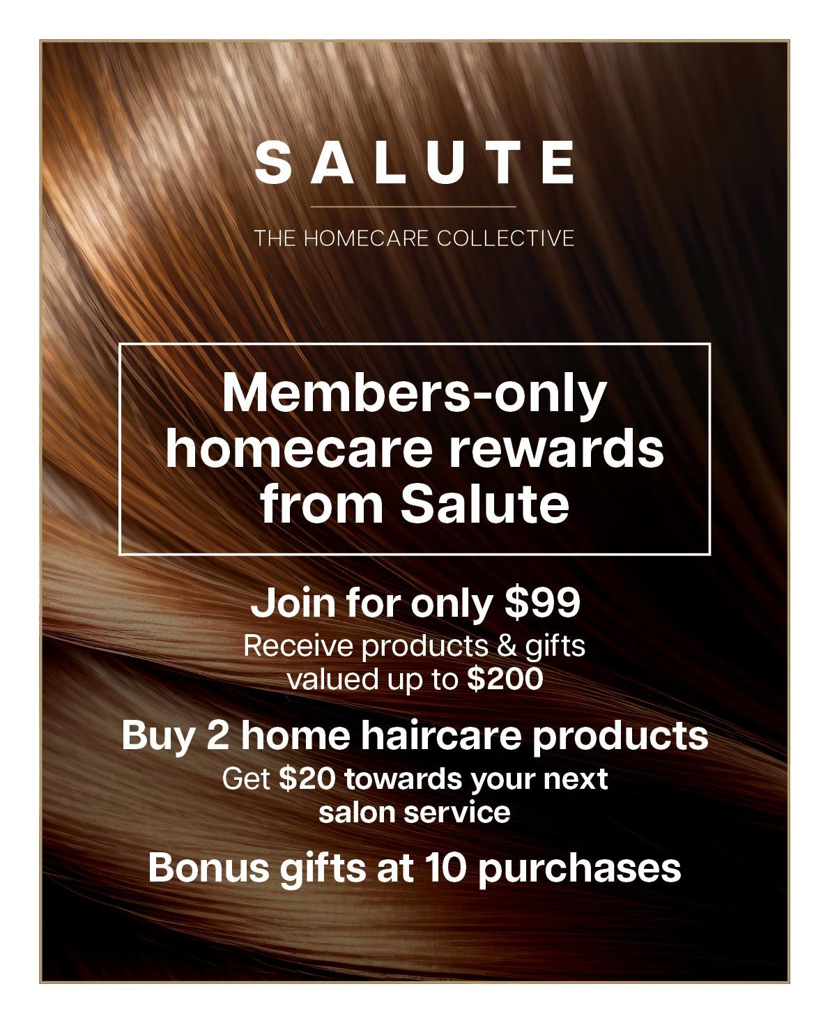 • Once joined, every purchase of two professional haircare products in one transaction = 2 stamps + $20 towards your next salon service.